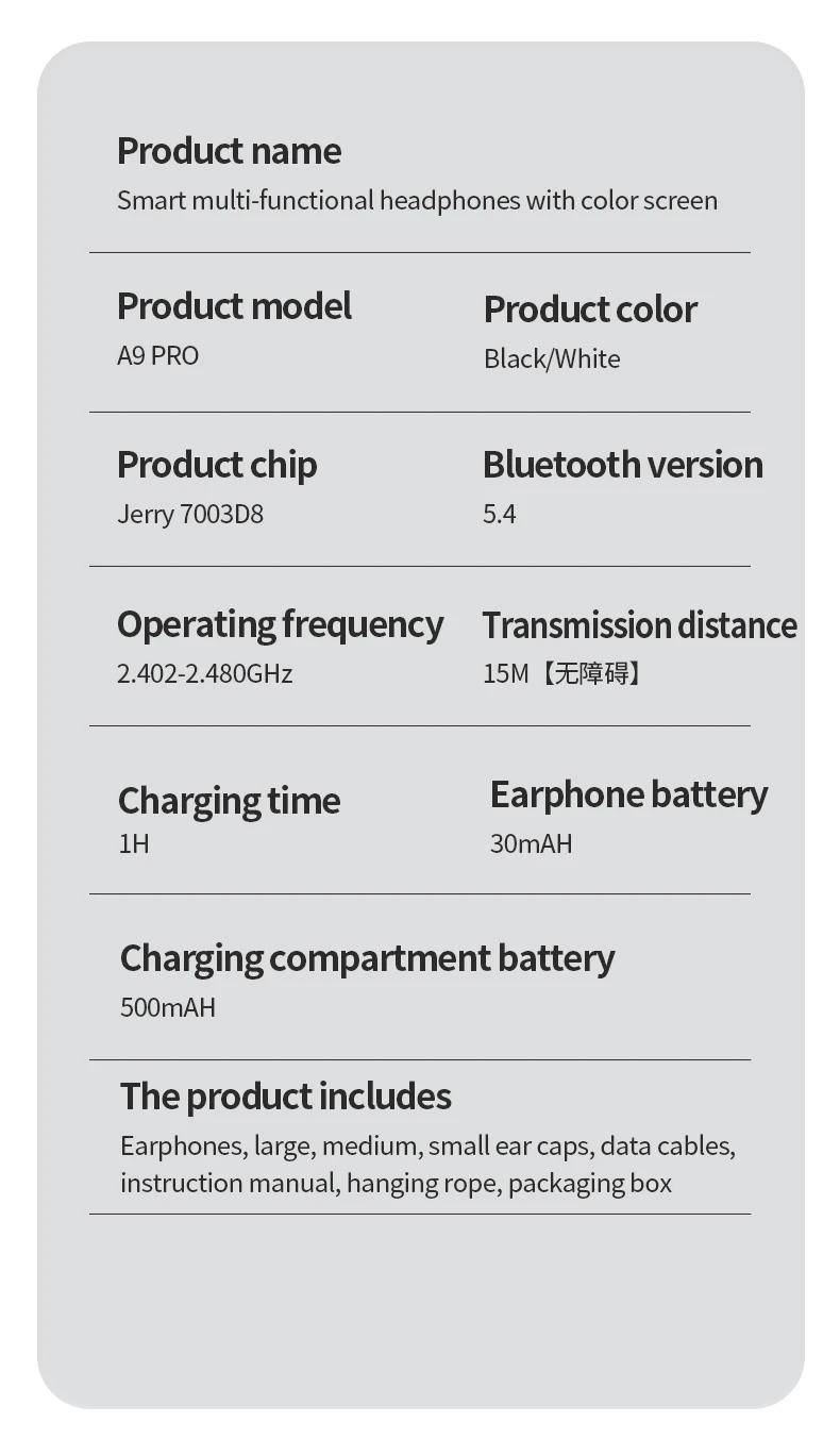 7. Battery type: 3.7V 500mAh polymer battery with protection plate (3C fast charging battery), 30mAh earphone battery